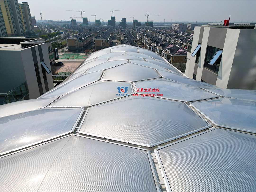 嘉興長安里ETFE氣枕鋼膜結構頂棚工程位于嘉興市長安里街區,該項目總用鋼量約440噸,ETFE膜結構展開面積約3200平米。