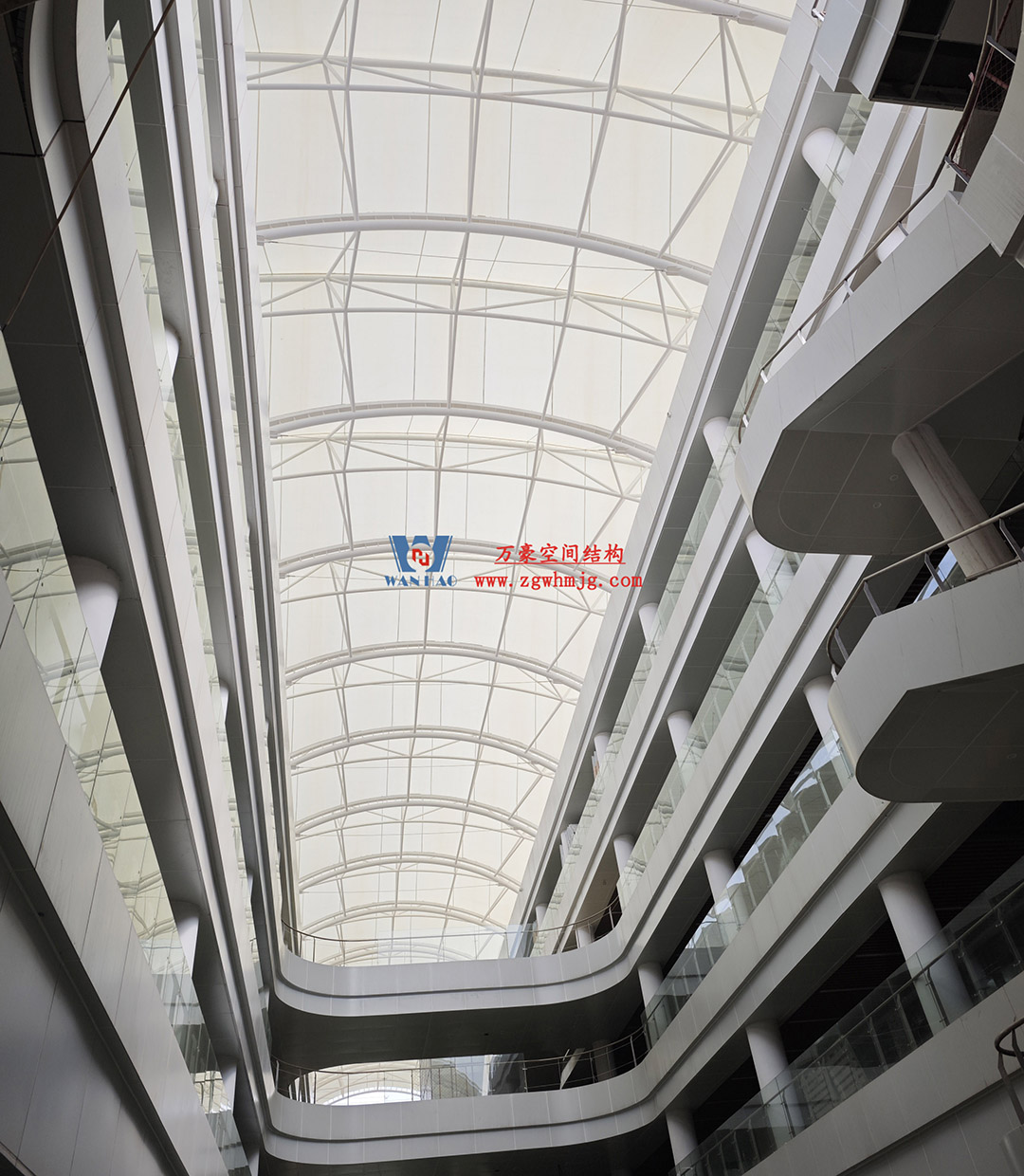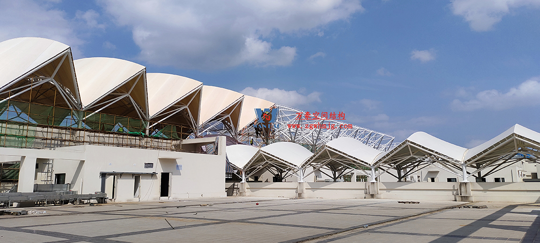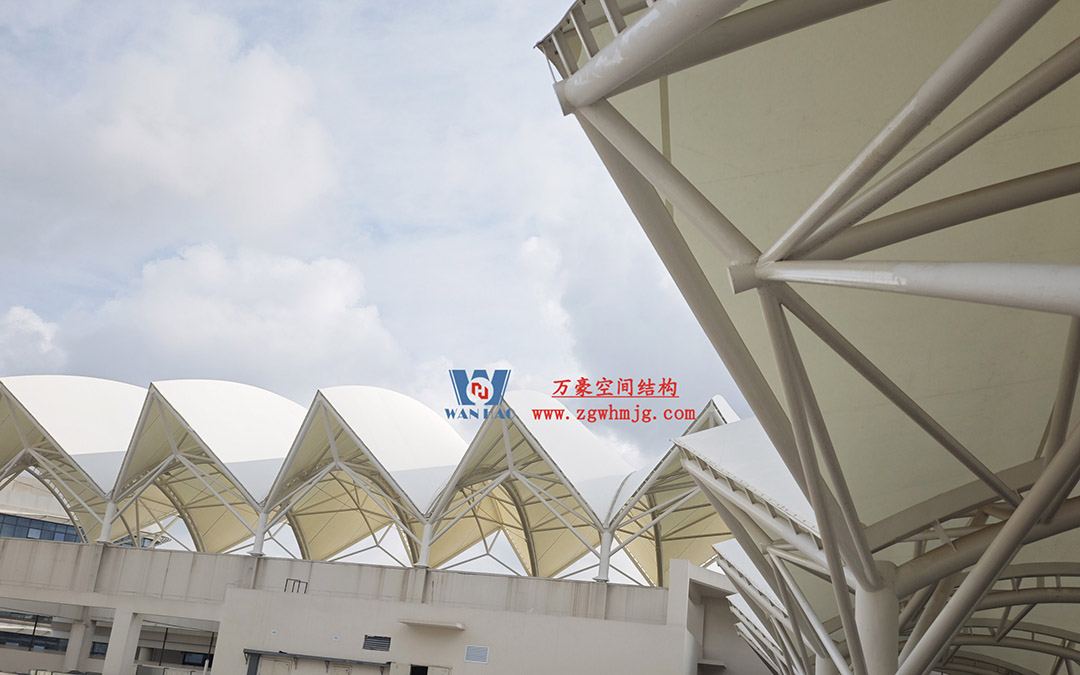 海南醫(yī)學(xué)院第一附屬醫(yī)院江東新院區(qū)膜結(jié)構(gòu)工程,該項目用鋼量約360噸,PTFE膜結(jié)構(gòu)展開面積約4500平米。
