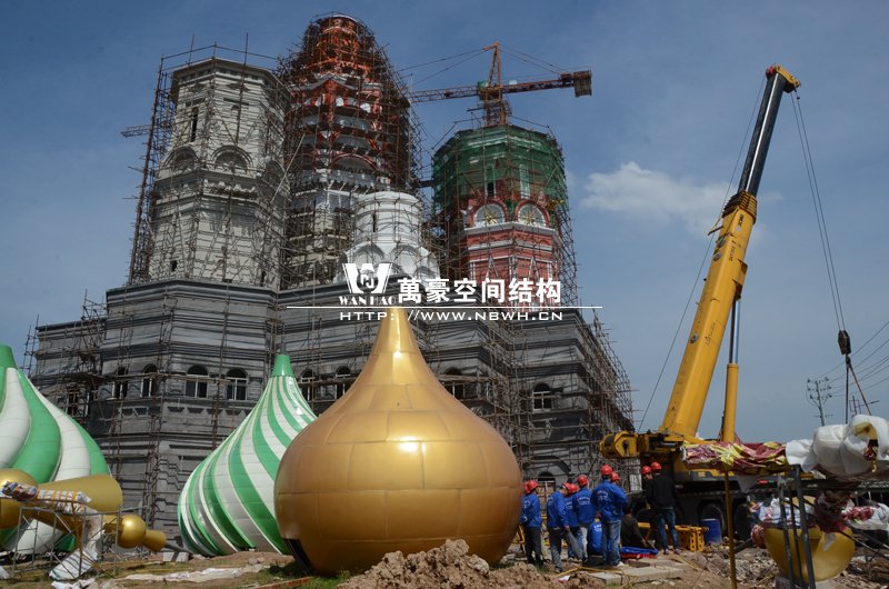 橫店俄羅斯館屋頂鋼結構裝飾球吊裝 俄羅斯館鋼結構階段 牡丹花仙湖看臺膜結構工程效果圖