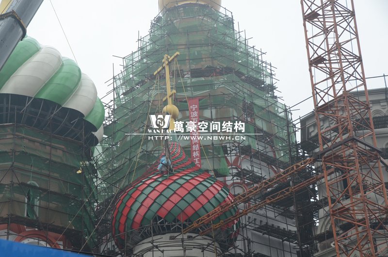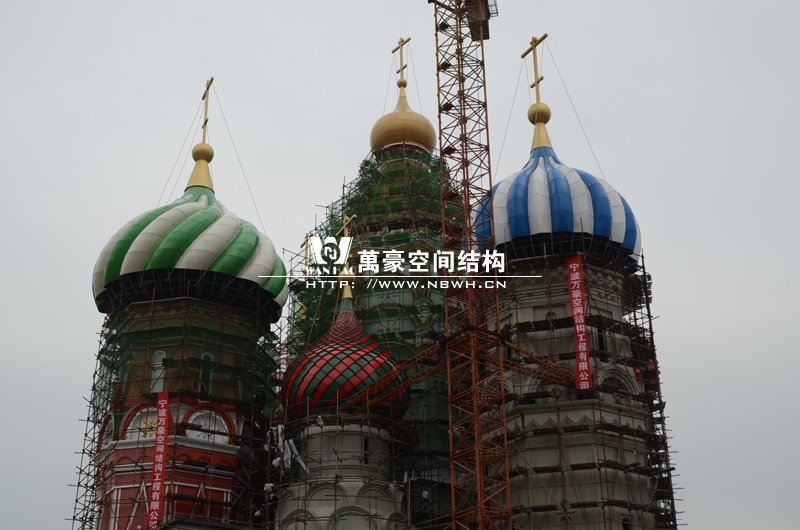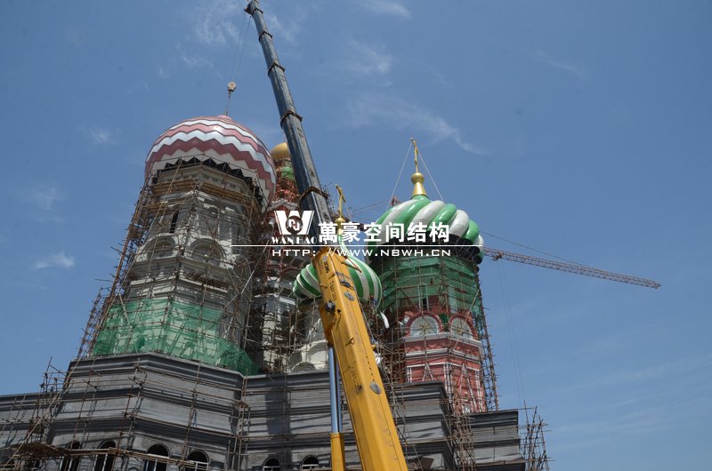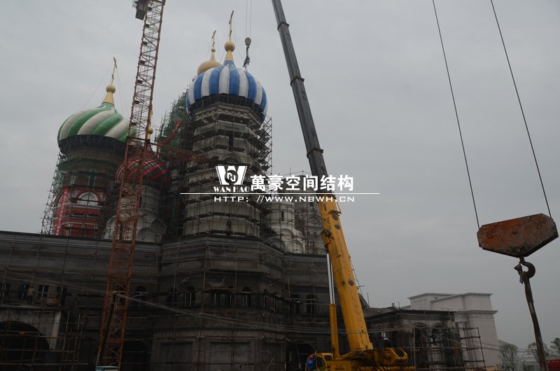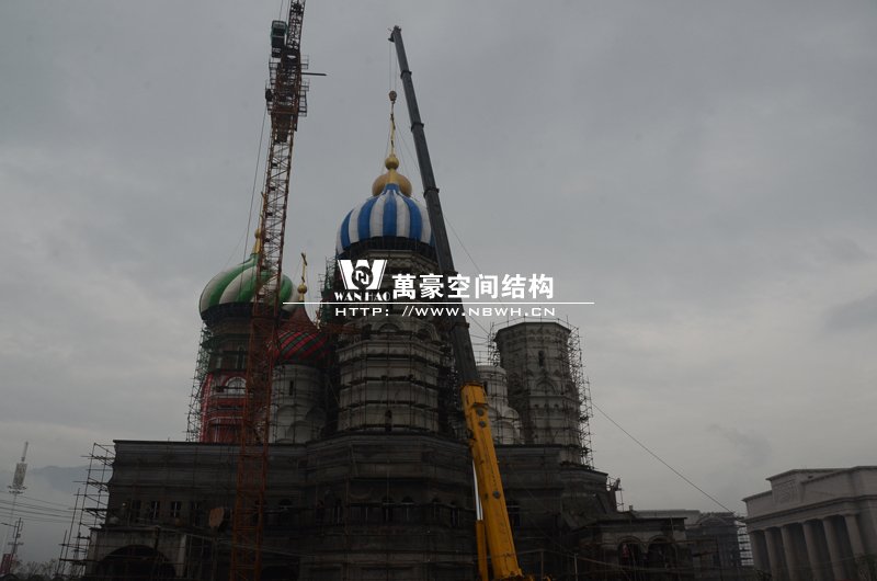 橫店影視城俄羅斯館屋頂鋼結構裝飾球吊裝完成,本次吊裝的九個裝飾采用鋼結構骨架、鋁合金外殼,最重的裝飾球達20來噸,采用300多噸的大吊車進行吊裝。