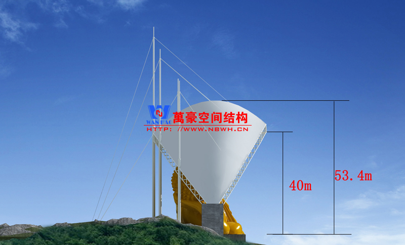 橫店釋伽牟尼大佛膜結構雨棚位于橫店影視城內,主要是給大佛加一個雨棚,起到遮陽擋雨的作用,讓釋伽牟尼佛像減少自然環境的侵蝕。以上就是大佛膜結構雨棚的效果圖,大家可以看一下。