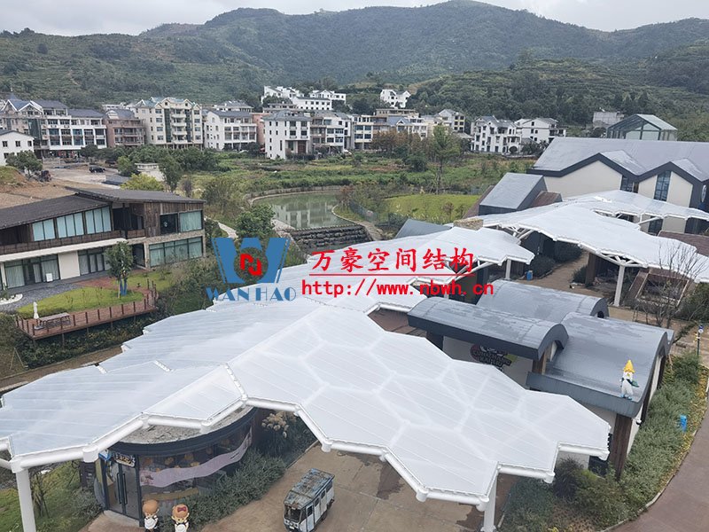 樂清鐵定溜溜樂園膜結(jié)構(gòu)工程位于浙江省溫州市樂清市,項(xiàng)目鋼膜結(jié)構(gòu)雨棚包括6號(hào)商業(yè)街蜂窩狀ETFE膜結(jié)構(gòu)、檢票口PTFE膜結(jié)構(gòu)、售票口PVDF膜結(jié)構(gòu)。