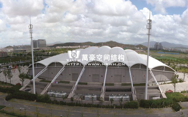 頂層膜結(jié)構(gòu)分內(nèi)外膜,外膜采用PTFE材料,水平投影面積約15000平方米,局部采用PVC內(nèi)膜,覆蓋在比賽場(chǎng)地及觀眾席上方,工程整體結(jié)構(gòu)造型美觀新穎,與周圍環(huán)境相融洽。為寧波市獨(dú)具景觀特色的標(biāo)志性建筑。