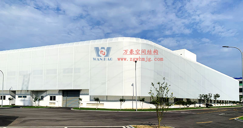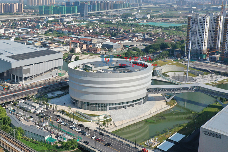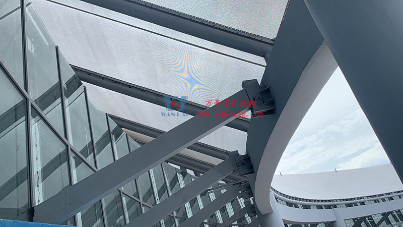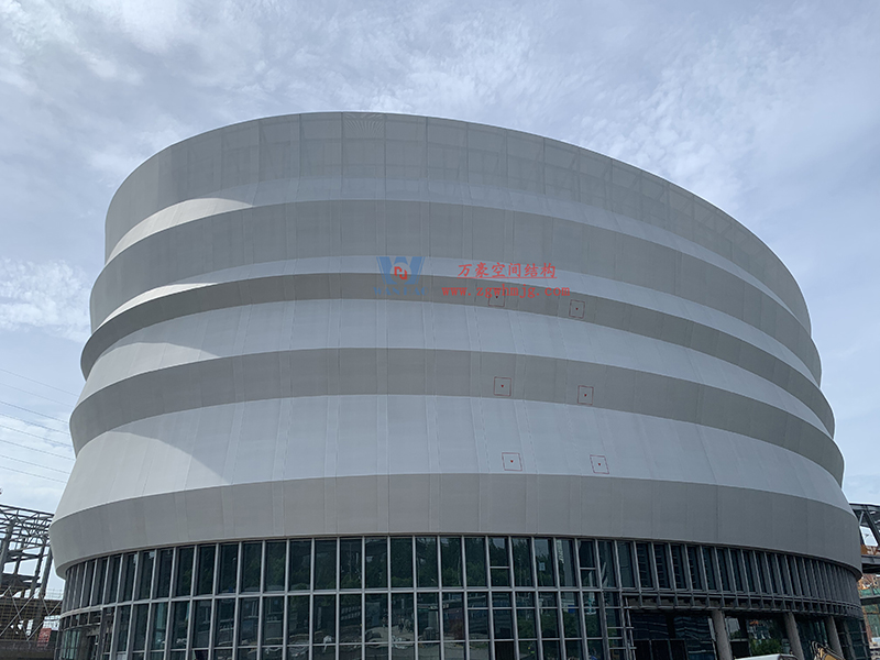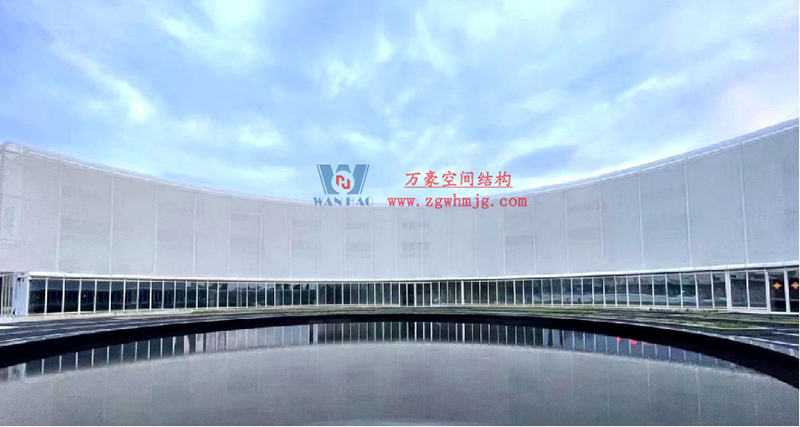由萬豪承建的紹興國際會(huì)展館中心外立面網(wǎng)格織物膜,由5凸5凹不同標(biāo)高的柔線組合成飄絲帶,視覺效果極具沖擊力。