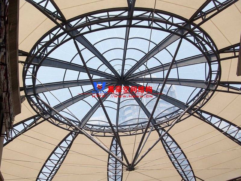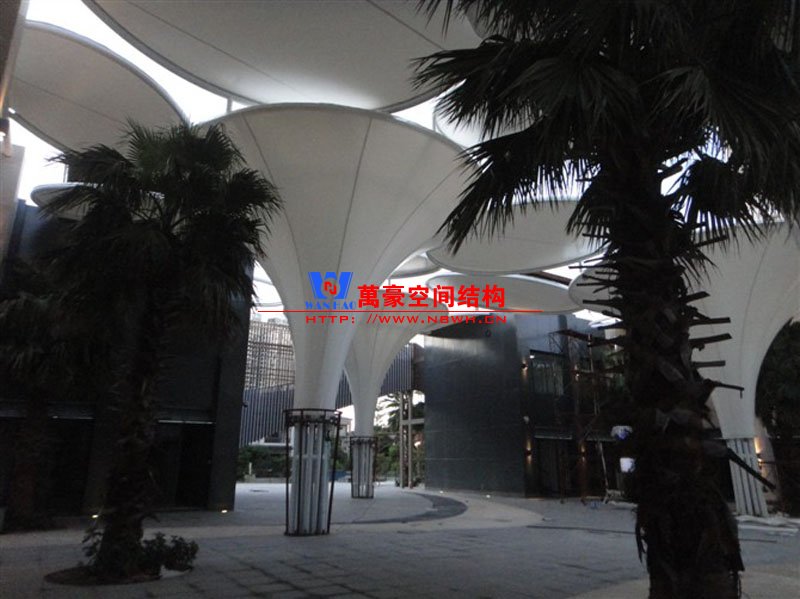 商業(yè)街在城市中占有相當(dāng)大的比重。商業(yè)街的建筑與環(huán)境是城市文明的窗口,代表著物質(zhì)文明和精神文明的水平,同時,也是景觀環(huán)境的重要組成部分。商業(yè)街膜結(jié)構(gòu)輕巧別致極具現(xiàn)代化風(fēng)格,且表現(xiàn)形式多樣易于安裝移動,在商業(yè)街設(shè)計中得以廣泛應(yīng)用。