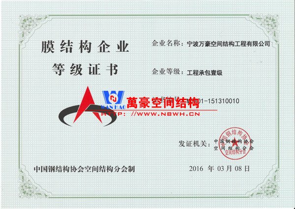 • 膜結(jié)構(gòu)工程總承包特級(jí)(設(shè)計(jì)、制作、安裝)資質(zhì),鋼結(jié)構(gòu)工程二級(jí)資質(zhì)