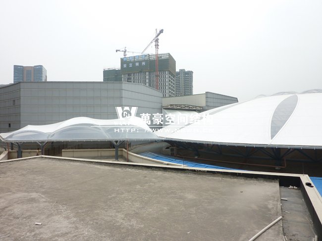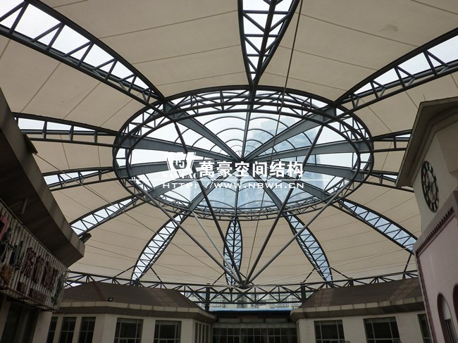 工程位于蕭山開元廣場商業購物中心,整體工程采用骨架穹頂結構,屋面直徑為50米,總面積約6000平方米,屋蓋體系脈絡清晰流暢,造型簡潔有力,力圖體現結構與材料的自身美感,精致的鋼架,潔白的膜材,賦予建筑高技派和未來主義色彩。