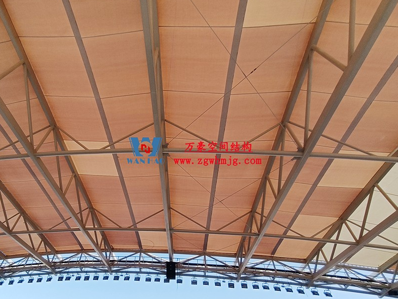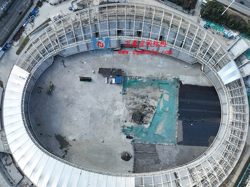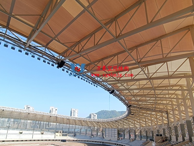 平陽體育中心設計功能為1.5萬座中型乙級體育場及其配套用房,總建筑面積49610平方米,其中鋼結構約3800噸、PTFE膜結構展開面積約25000平方。體育場鋼結構工程鋼柱采用箱型焊接截面,屋蓋采用19種不同跨度懸挑鋼桁架結構,節點均采用相貫焊接節點。屋面覆索膜結構,PTFE膜結構的使用,增加了整個體育場的空間感和動態感,也讓體育館成為了平陽當地的視覺焦點。