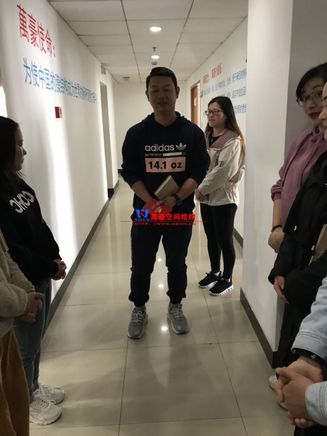今日晨會,在主持人分享完工作心得后,萬豪膜結構給剛新婚不久的項目經理林杰發了一個大紅包,祝賀他新婚快樂。