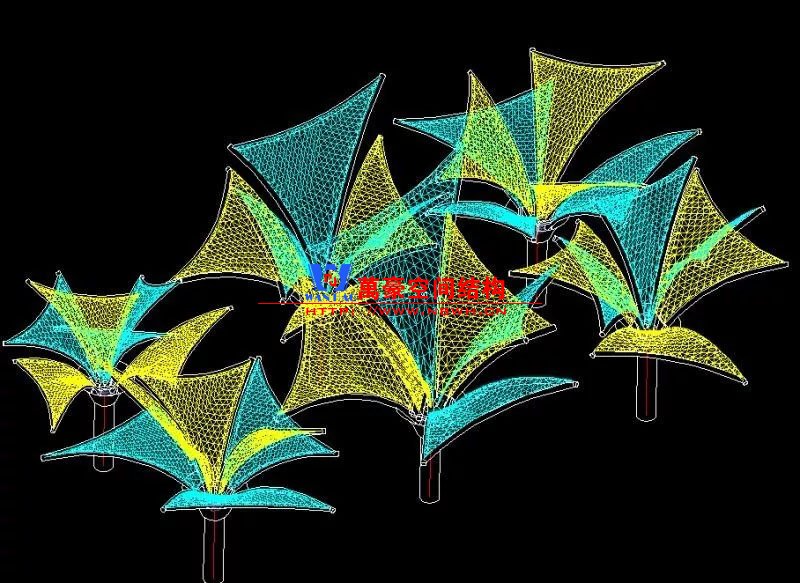 其中主席臺龍舟拉膜項目高度為7.25米,膜結構屋面材質為PTFE膜材。廣場鋼拉膜項目由六個龍船花造形景觀組成,每個龍船花景觀造形立柱的高度不得低于3.80米,花瓣造形最低高度 7.54米,花瓣造形最高高度9.608米,膜結構屋面材質為 PTFE網格基布雙面貼透明ETFE建筑膜。
