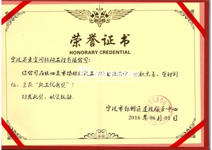 我司寧波聯(lián)心菜市場膜結(jié)構(gòu)工程項目榮獲“施工優(yōu)秀獎”