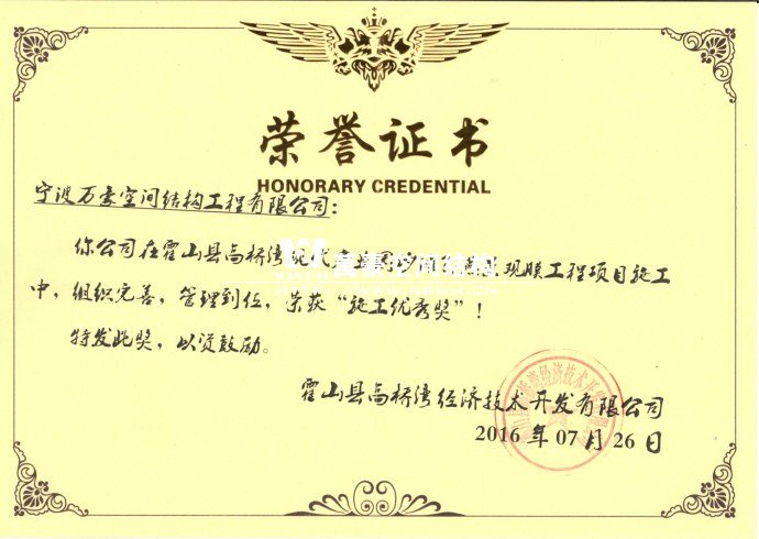 霍山縣飛燕景觀膜項目榮獲“施工優秀獎”