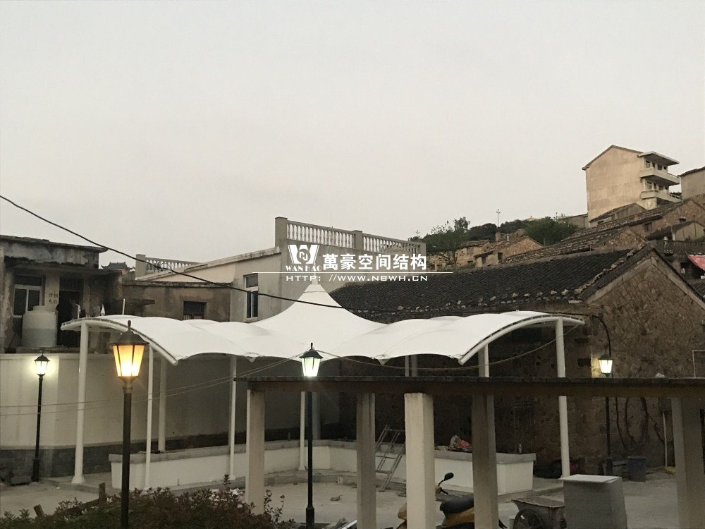 大陳島海鮮膜結構工程位于下大陳島衛星村步行街后半段(臺州雷力建設有限公司對面),該工程由我司現場考察、多次深化、制作及安裝,設計抗臺等級12級,鋼構最高點高度達6.5米;