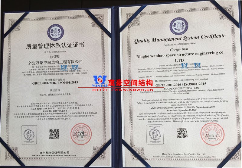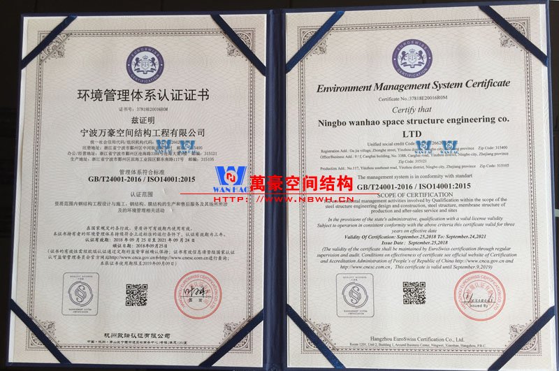 最近,寧波萬豪空間結構工程有限公司進行了最新一次的質量管理體系認證審核,各項指標自然是符合要求,順利的拿到了4項管理體系認證證書,大家可以見證一下。